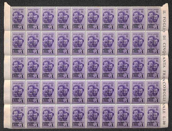 1945 - 1 lira Bandiera (14/14aa) - intero foglio fi 50 con soprastampe in basso (data su Repubblica) - consueti errori di soprastampa (sette 14b + sei 14c + cinque 14d) + altre imperfezioni della soprastampa - gomma integra - insieme non comune