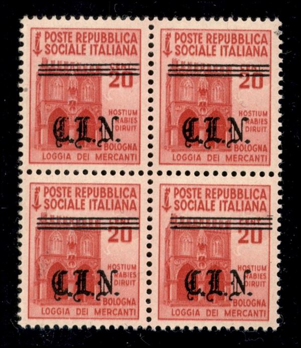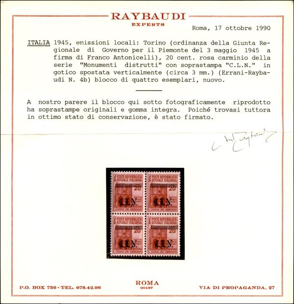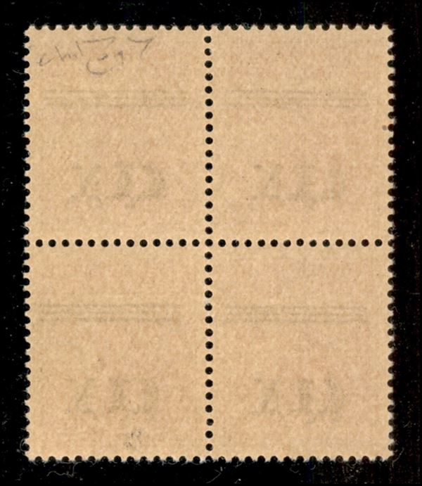1945 - 20 cent (Unificato 4 - Errani 4b) in quartina con soprastampa spostata in basso - gomma integra - cert. Raybaudi