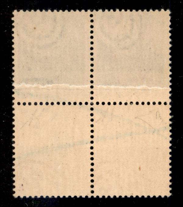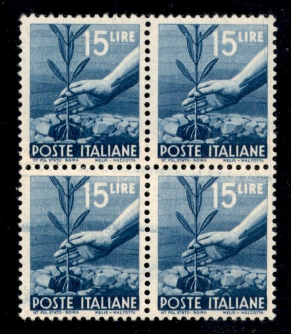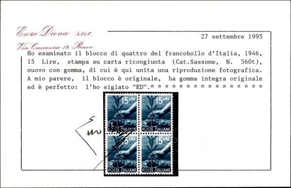 1946 - 15 cent (560t) - blocco di quattro su carta ricongiunta - gomma integra - cert. Diena (2.400)