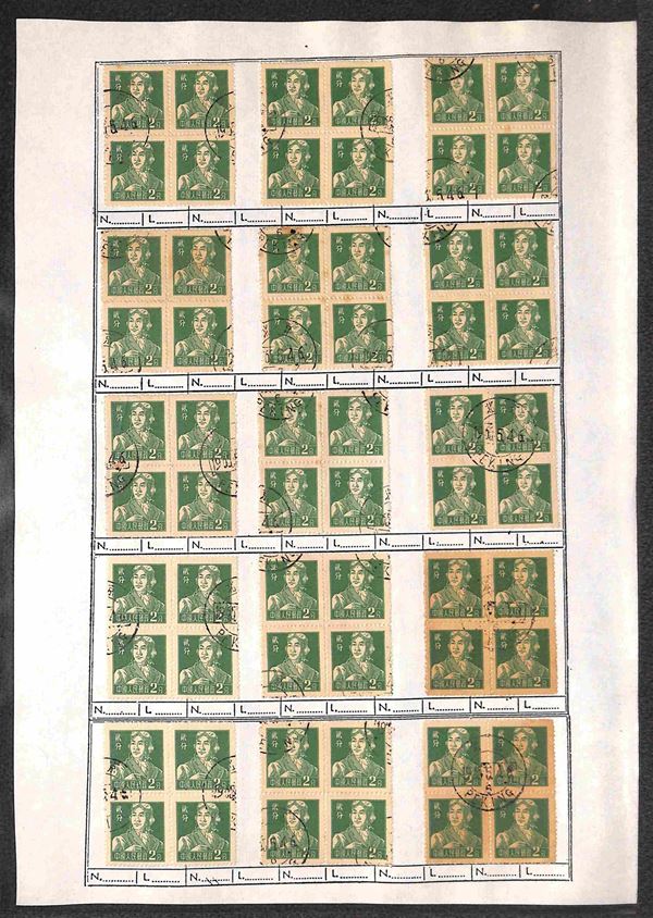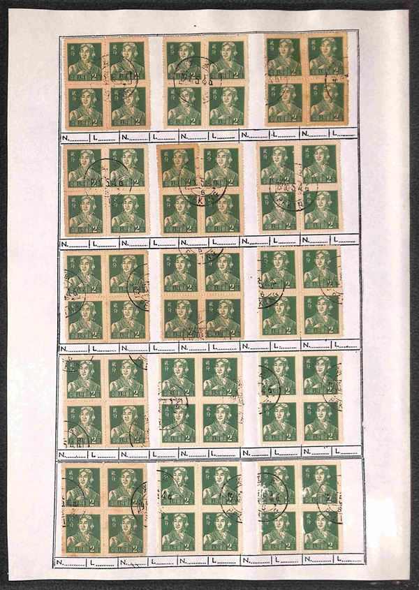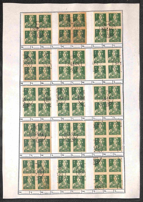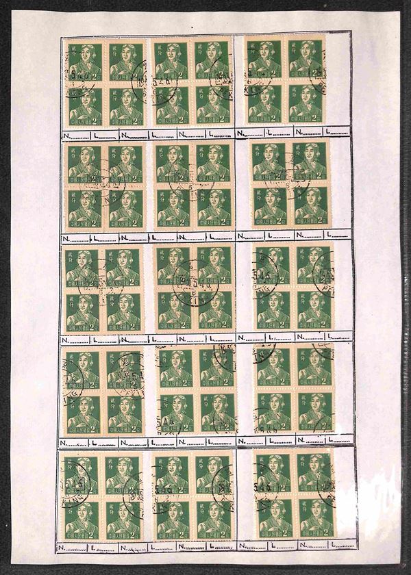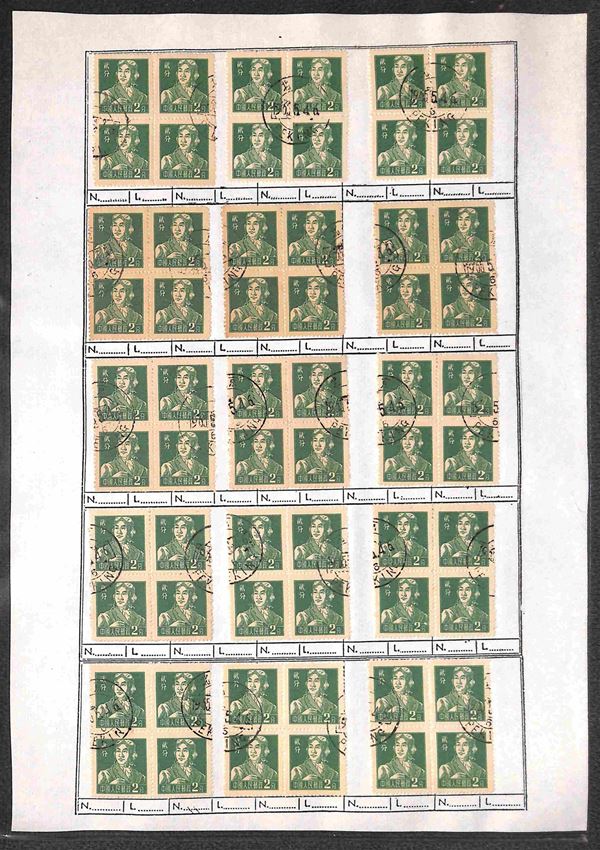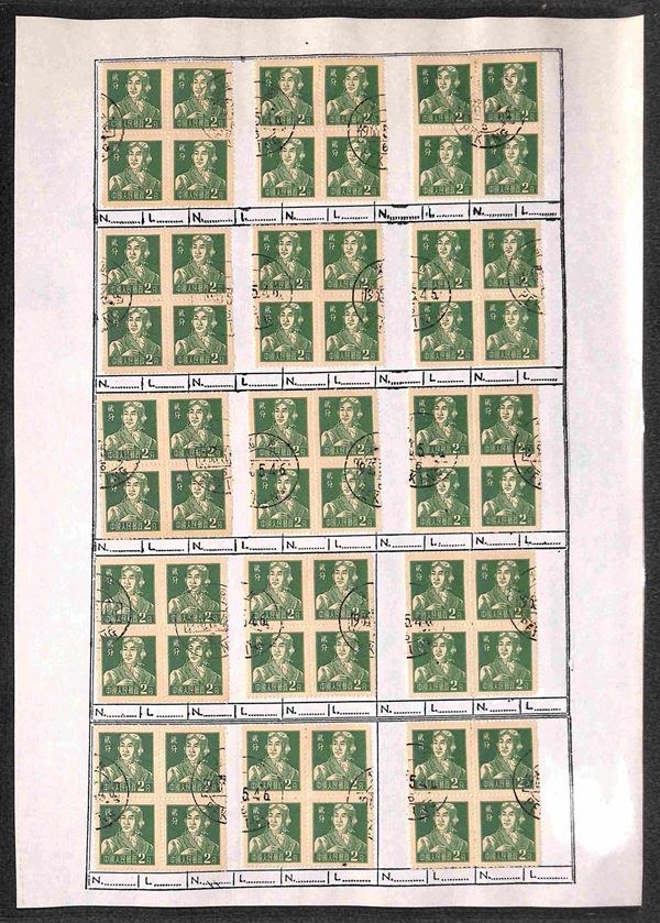 1956 - 2 fen (299) - 135 quartine usate su fogli d'album - notati una decina di blocchi del carta bruna (299b)