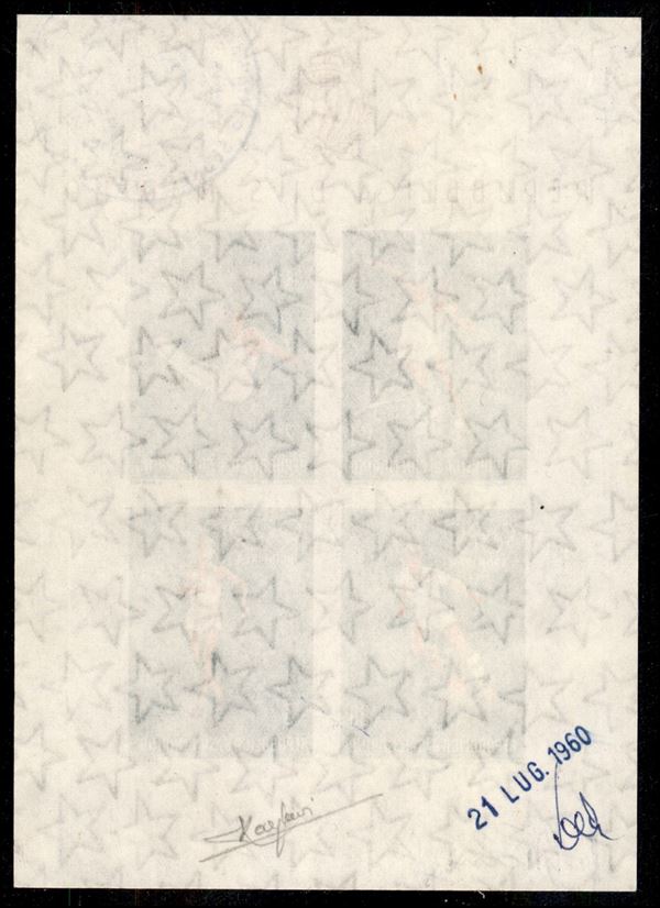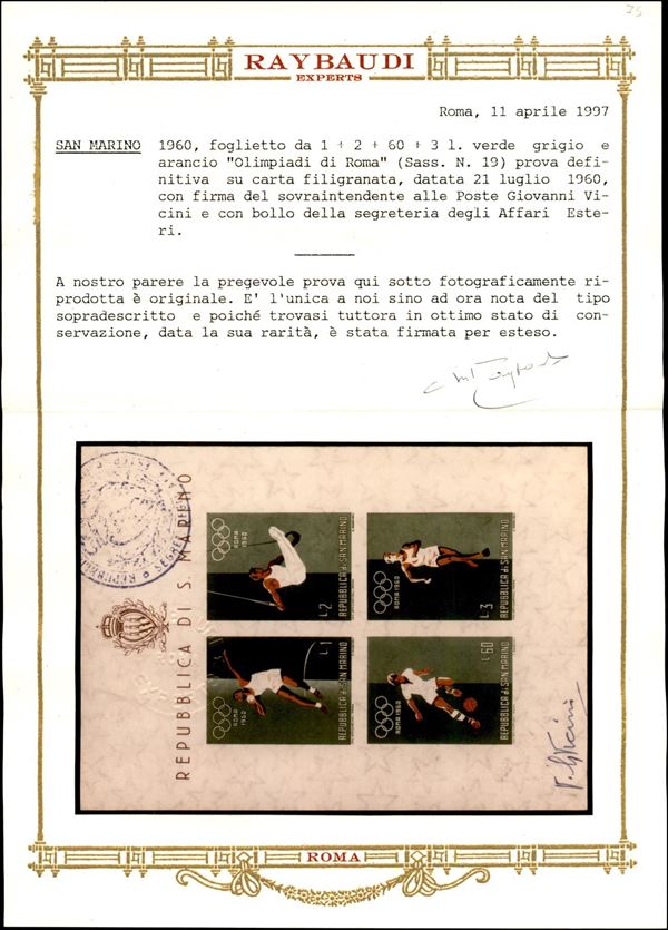 1960 - Prove d'archivio - Olimpiadi (19) - Visto si Stampi (foglietto autorizzato dal Sovraintendente Vicini - senza gomma - cert Oro Raybaudi