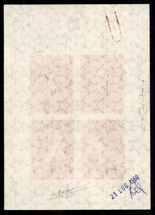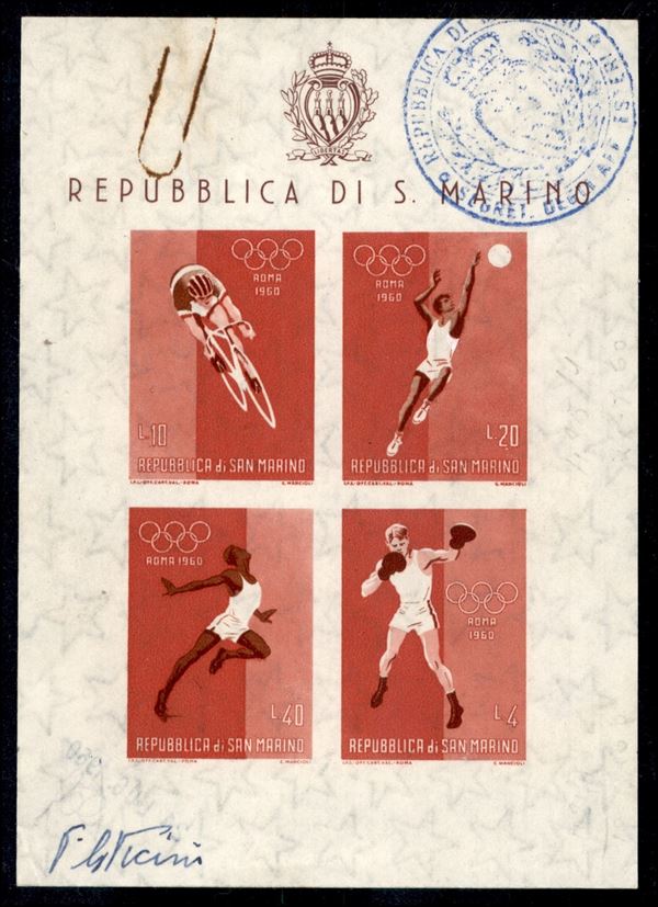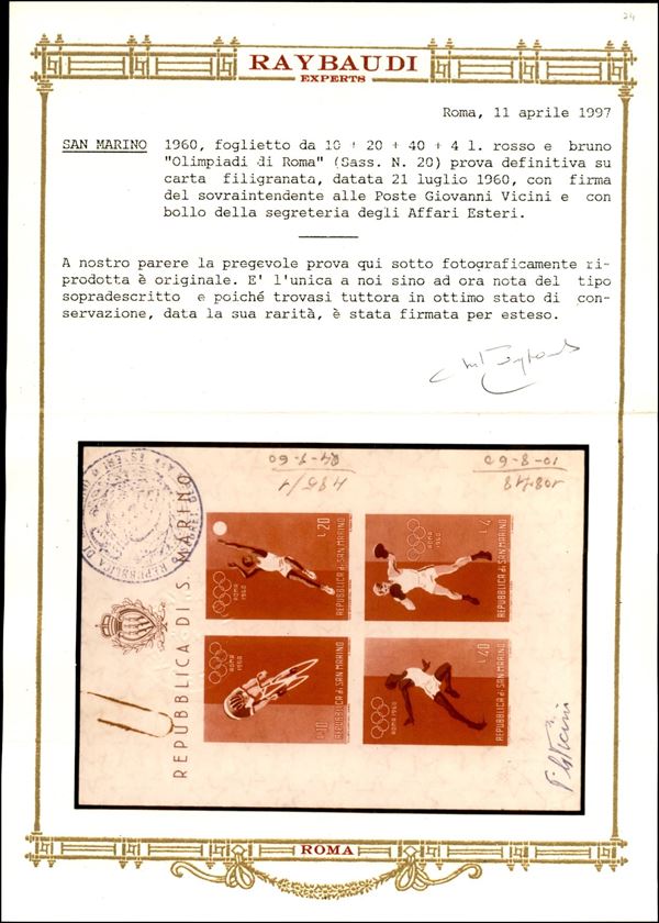 1960 - Prove d'archivio - Olimpiadi (20) - Visto si Stampi (foglietto autorizzato dal Sovraintendente Vicini - senza gomma - cert Oro Raybaudi