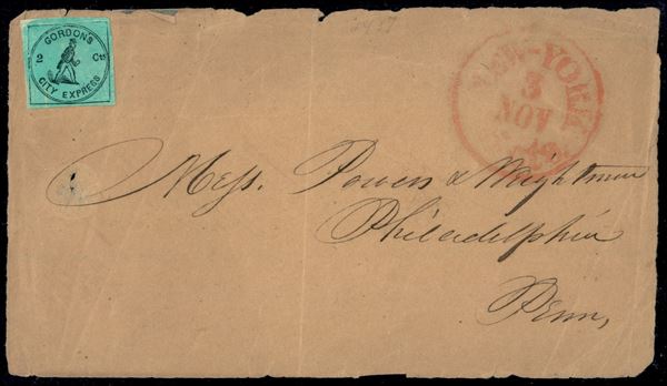2 cent Gordons's City Express su frontespizio di bustina - New York 3 nov 3 cts (in rosso) a lato - da esaminare