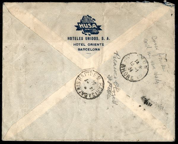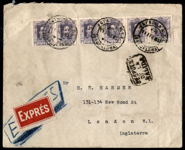 20 cent Alfonso (288F - senza numero di controllo) - striscia di 6 su espresso da Barcellona (Estacion) a Londra del 11.2.34
