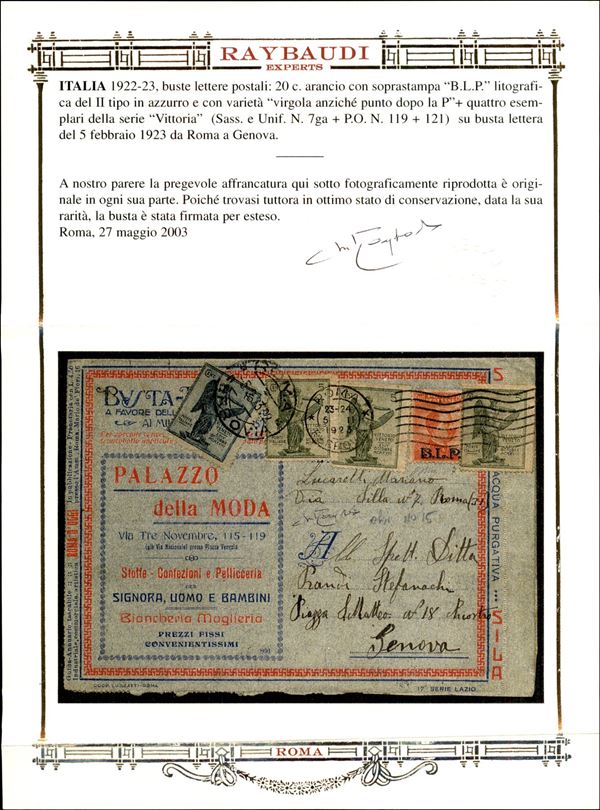 20 cent BLP (7ga) con virgola dopo P + complementari Vittoria (119 tre + 121) - busta speciale 17 Lazio da Roma a Genova del 5.2.23 - Oliva + cert. oro Raybaudi (7.000+)