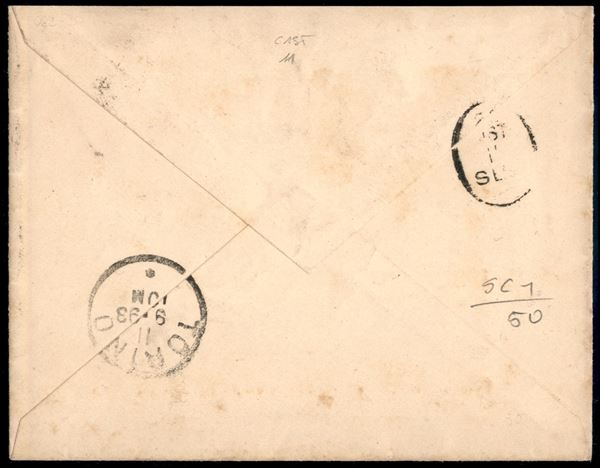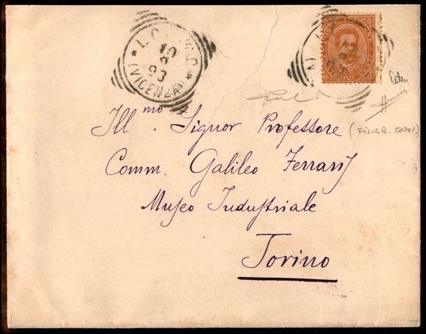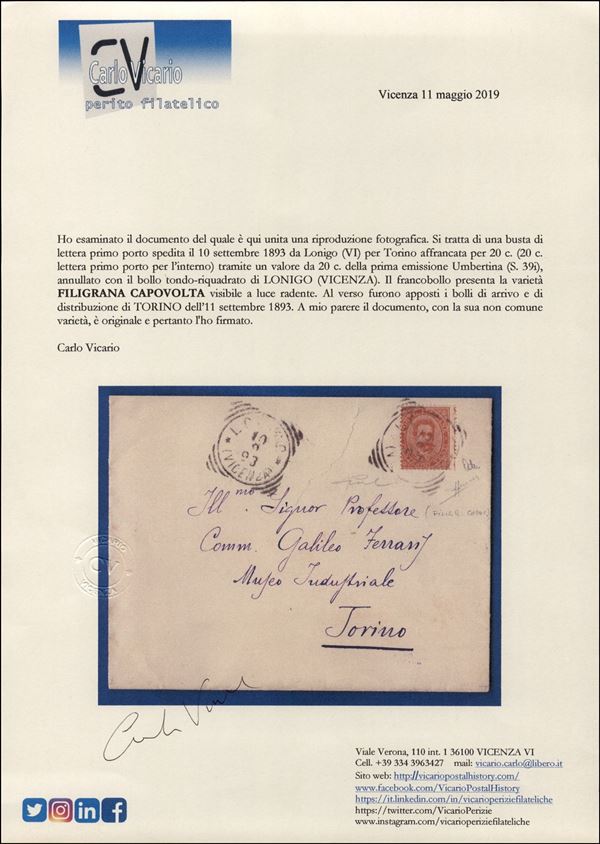20 cent Umberto (39i varietà) con dentellatura spostata (sulle diciture a margine) e filigrana capovolta - busta da Lonigo a Torino del 10.9.93 - Sorani