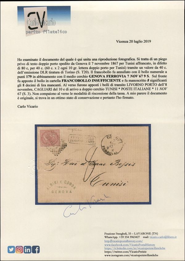 40 cent De La Rue (L20) su lettera da Genova a Tunisi del 7.11.67 - tassata - R. Diena