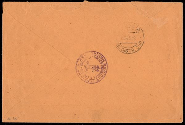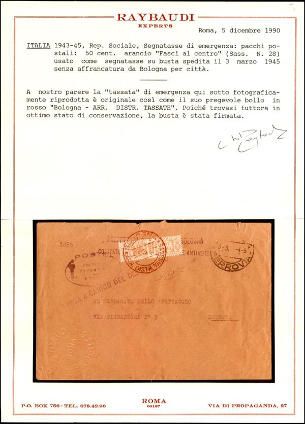 50 cent (28 - Pacchi Postali) usato come Segnatasse su busta per cittą - Bologna 3.3.45 - annullo rosso - cert. Raybaudi