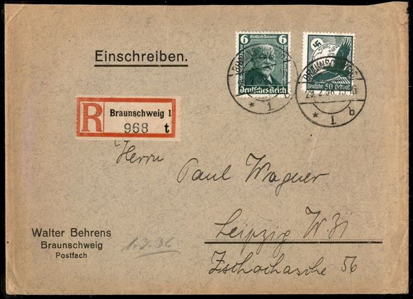 6 pfennig verde (604b) + 50 pfennig (535) - raccomandata da Braunsweiga Lipsia del 29.2.38