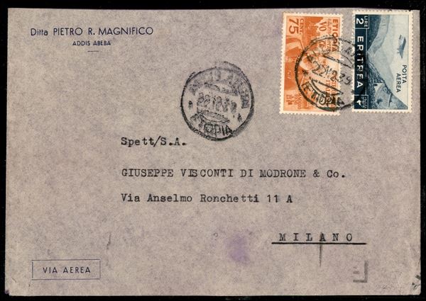 75 cent (6) + 2 lire Posta Aerea (Eritrea 23) su lettera via aerea da Addis Abeba per Milano del 22.2.39