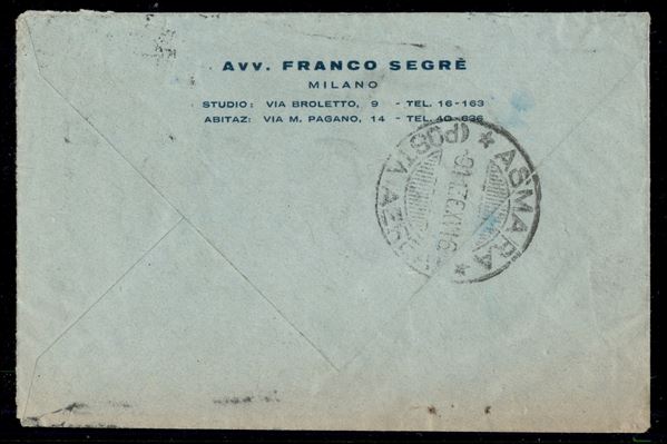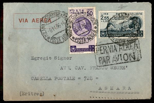 Aerogramma raccomandato affrancato con Bimillenario Oraziano (401 + 405) da Milano a Asmara del 6.11.36 - Sorani