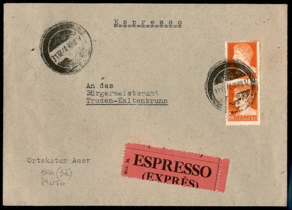 Alpenvorland - coppia del 1,75 lire (254 - Regno) su espresso da Ora (Bolzano) a Truden del 31.12.1944