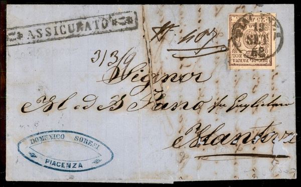 Assicurata affrancata fronte retro con due 25 cent (10) - uno danneggiato perchè usato come chiudilettera - lettera da Piacenza a Mantova del 19.9.58