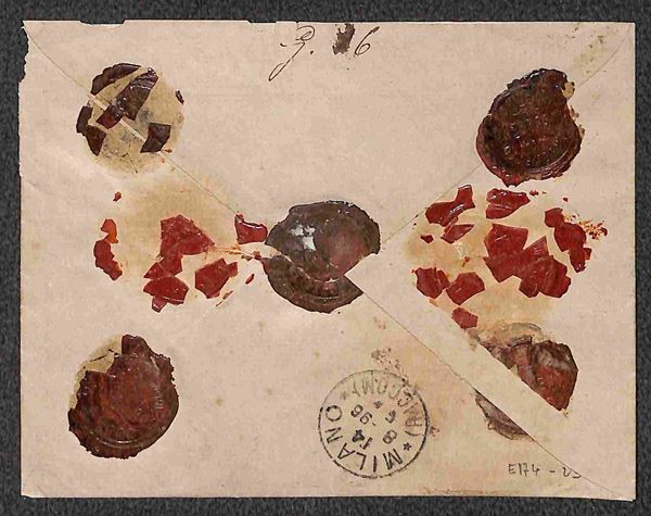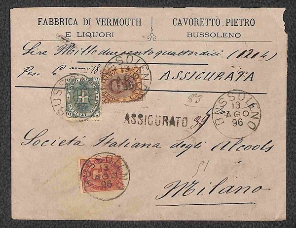 Assicurata per 1214 lire e peso 18 gr. affrancata con 1 lira+10 cent+5 cent (38+48+59) da Bussoleno per Milano del 13.8.96