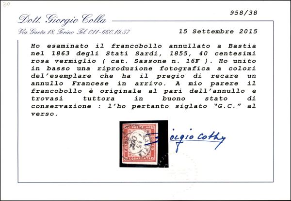 Bastia (P.ti R2) apposto in arrivo - 40 cent (16F - Sardegna) - usato - margini perfetti - appena rasente a sinistra in alto - cert. Colla
