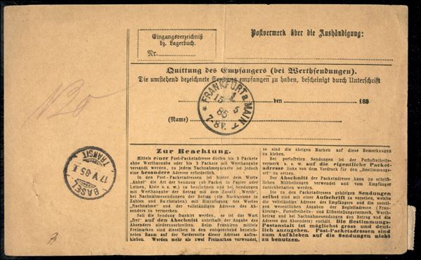 Bollettino Pacchi da Konigsberg a Wohlem del 13.5.85 con affrancatura tricolore (40+43+44)