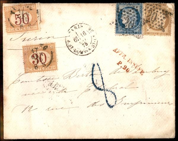 Busta da Parigi del 16.1.75 affrancata per 40 cent (51+53 difettoso in angolo) per Torino tassata per 80 cent (7+9 - segnatasse) - Affr.Insuff. P.20 in rosso a lato