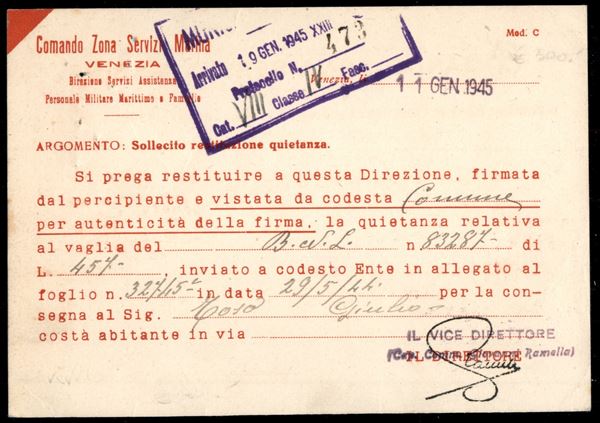 Cartolina in franchigia "Comando Zona Servizi Marina" - Venezia (137/A) per Tarcento del 11.1.45
