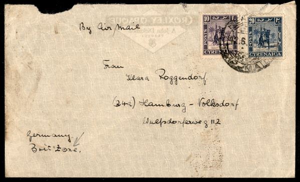 Cavaliere Senussita 10 mill (7) + 20 mill (9) su lettera per la Germania da Bengasi del 2.5.50