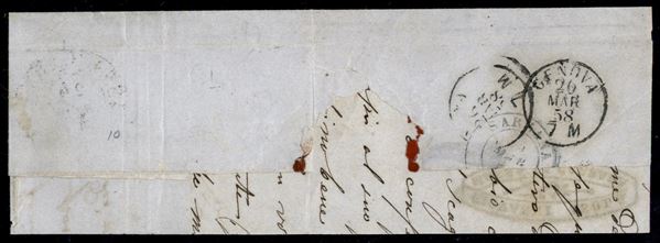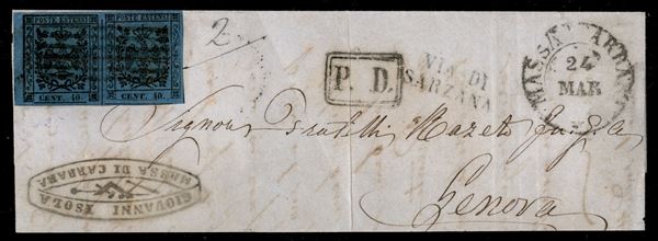 Coppia bordo foglio (posiz. 1/2) del 40 cent azzurro scuro (10) con clichč disallineati e doppio filetto a destra pił punto grosso - busta da Massa Carrara a Genova del 24.3.58 - PD in cartella - molto bella
