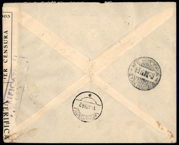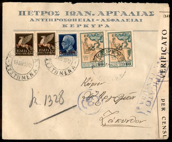 Coppia del 50 cent (1 Aerea) + 1,25 lire (8) su busta da Corfù a Argostoli del 13.4.1942 - affrancatura arricchita con valori Pro Antitubercolosi - censure