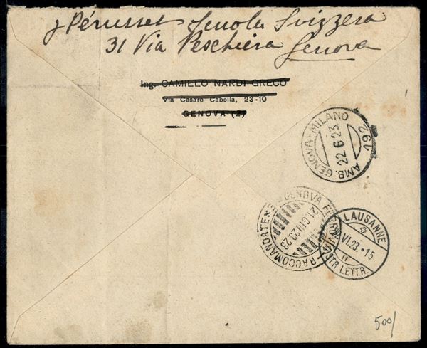 Coppia verticale 15 cent + coppia verticale 85 cent (108 + 112) su raccomandata da Genova per Losanna del 21.6.23