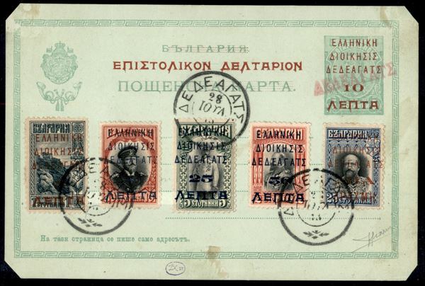 Dedeagatch - Soprastampati (4/8) - serie completa usata su intero postale da 10 lepta con soprastampa rossa - Sorani