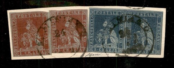 Due 1 crazia (4b) + coppia del 2 crazie (5b) su piccolo frammento - S. Miniato 24. ... 1852 - rara combinazione - Gazzi + Bolaffi