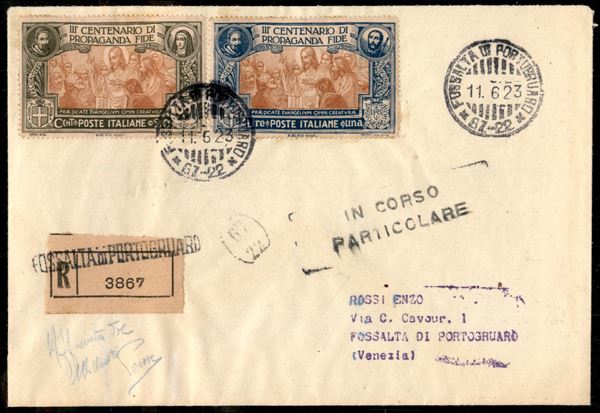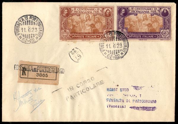 Due raccomandate con la serie completa Propaganda Fide (131/134) viaggiate nel primo giorno d'emissione 11.6.23 da Fossalta di Portogruaro a Venezia