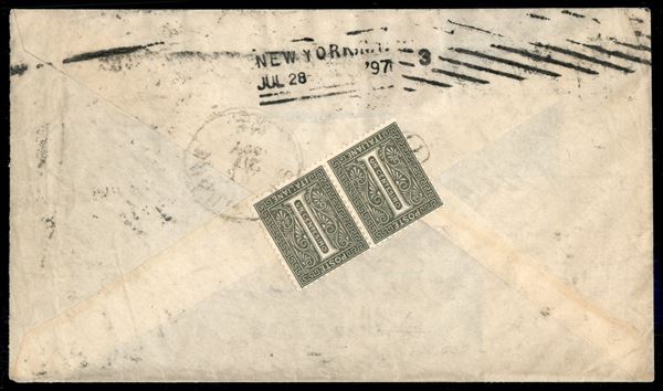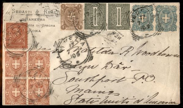 Due Re con valori gemelli - busta con affrancatura mista per 25 cent di Vittorio Emanuele II + Umberto (T14/T15 + 65/67) da Venezia per gli Stati Uniti d'America del 17.7.97 - Diena