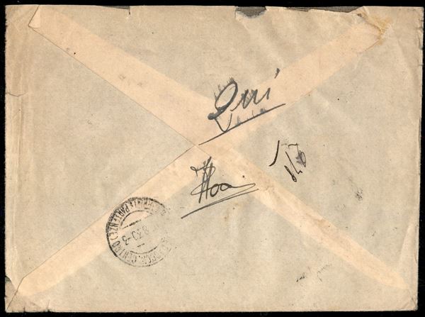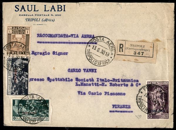 Ferrucci (65 + 66 + 1 Aerea) + complementare (65 - Libia) su aerogramma raccomandato da Tripoli a Firenze del 13.8.30 - Diena - da esaminare