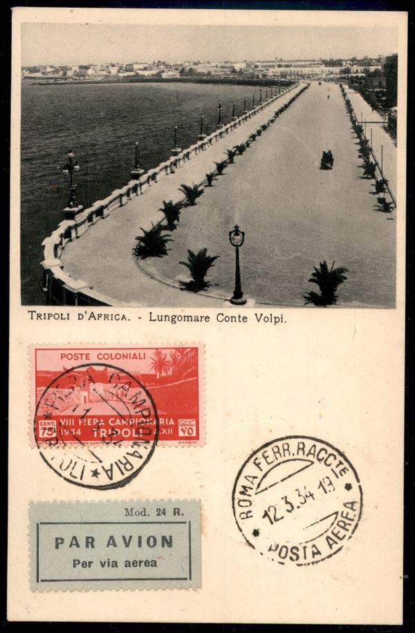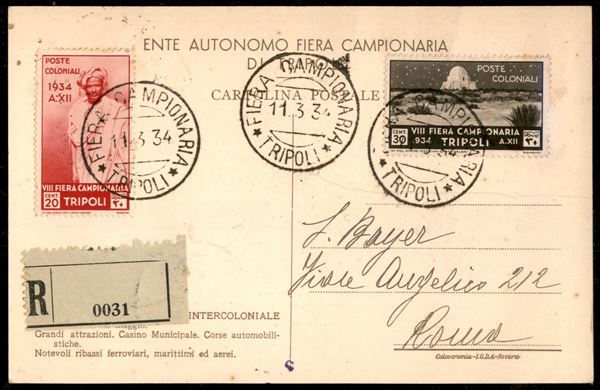 Fiera di Tripoli (126 + 128 + 130) - cartolina raccomandata da Tripoli a Roma del 11.3.34