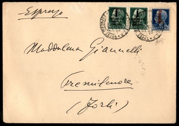 Firenze/Roma - Coppia del 25 cent (491) + 1,25 lire (495) su busta espresso da Firenze a Premilcuore del 4.5.44 - Biondi