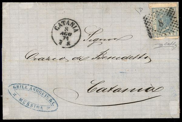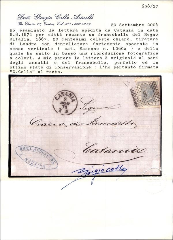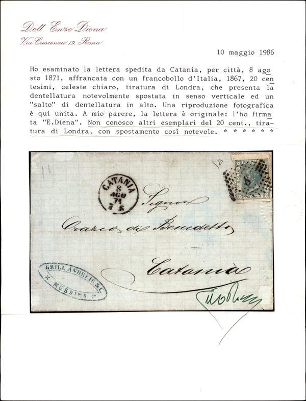 Formato diverso - 20 cent De La Rue (L26 varietà) con dentellatura orizzontale molto spostata su entrambi i lati (bordo foglio in alto) strappata a mano in basso - lettera da Catania a Catanzaro del 8.8.71 - spostamento non catalogato (unico conosciuto) - cert Diena + cert Colla