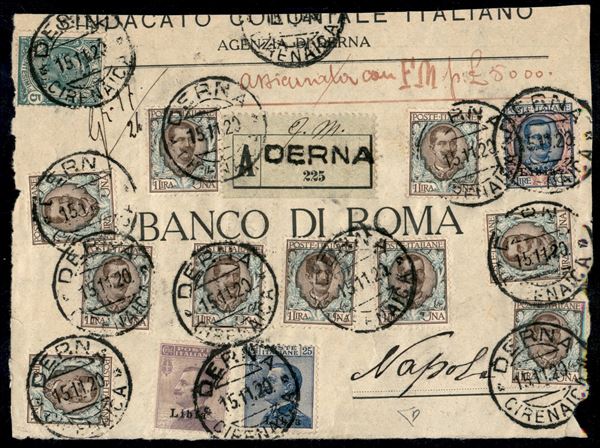 Frontespizio di assicurata da Derna a Napoli del 15.11.20 affrancata con 5 lire Floreale (11) + complementari (7 + 9 + Regno 77 dieci + 81)