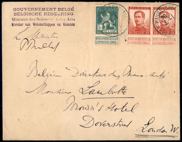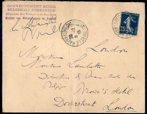 Governo Belga in Esilio - 2 buste da Le Havre a Londra del 1915 (febbraio) e 1917 (marzo) con firma autografa del Ministro