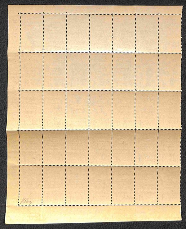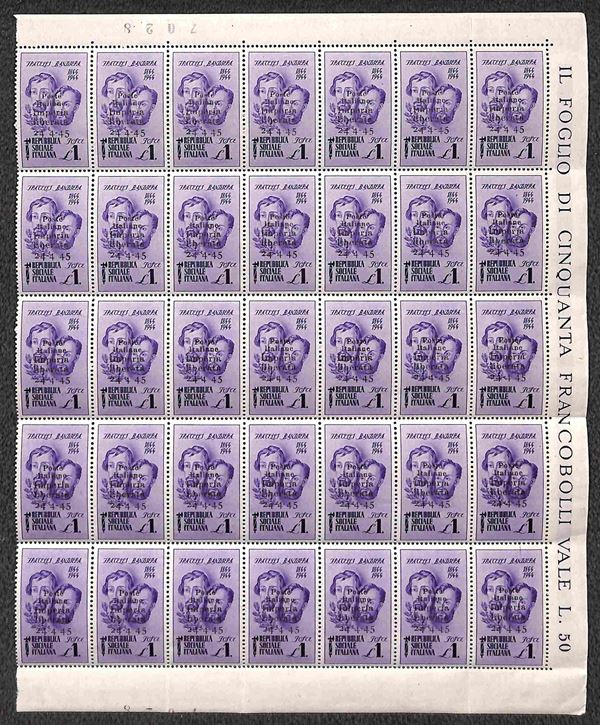 Imperia - 1945 - 1 lira Bandiera (14) - blocco angolare di 35 (posizioni 4/50) nuovo con piena gomma originale integra - presenta le varietà (trattini mancanti tra le cifre) b (4) c (5) d (6) - molto bello - G. Oliva