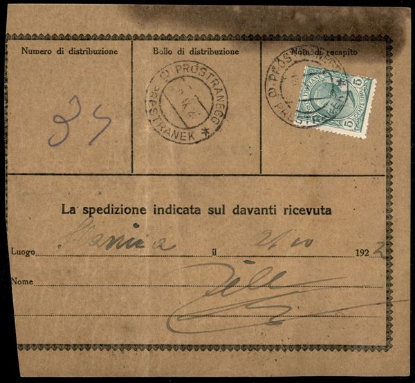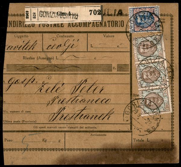 Indirizzo Postale Accompagnatorio - bollettino da Gorizia a Prestranek del 29.9.22 con affrancatura di Regno (77 tre + 78) - 5 cent Leoni (81) annullato al retro in arrivo