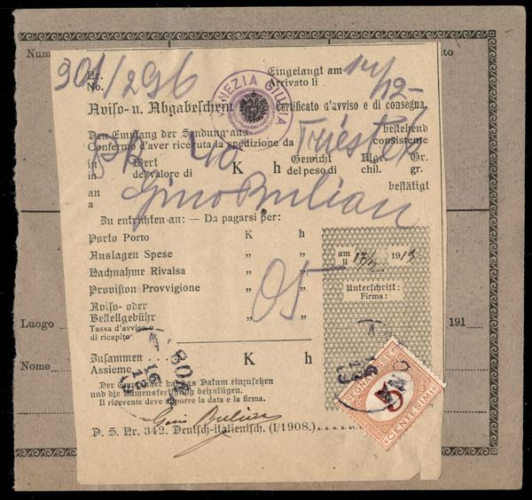 Indirizzo Postale Accompagnatorio - bollettino da Trieste a Albrona del 13.12.19 con affrancatura di Regno (82 + 85 coppia) con unito al retro certificato d'Avviso con 5 cent (20 Segnatasse)
