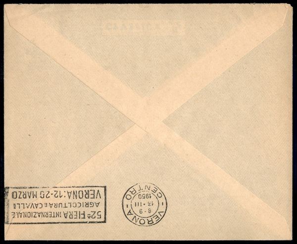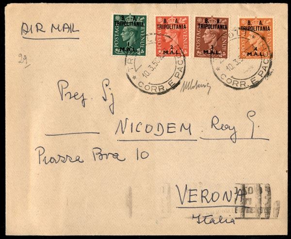 Lettera con affrancatura quattro colori - 1 mill + 2 mill + 3 mill + 4 mill (14/17) - da Tripoli per Verona del 10.3.50