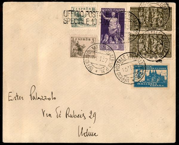 Lettera per Udine dall'Ufficio Postale Speciale 10 P.M. 16.11.37 con affrancatura mista Spagna Cid 5 cent + 10 cent + Italia Augusto 50 cent + Augusto aerea coppia 50 cent + etichetta di Mallorca