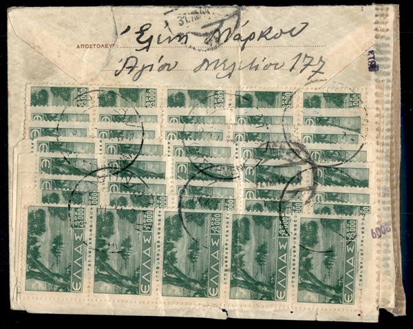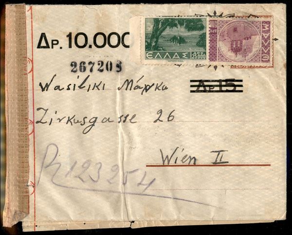 Occupazione Italiana della Grecia - Busta prestampata con nuovo valore e effige coperta da un 15000 dracme + 41 esemplari del 25000 dracme (uno sul fronte e al retro gli altri) per Vienna del 31.4.44 - censura