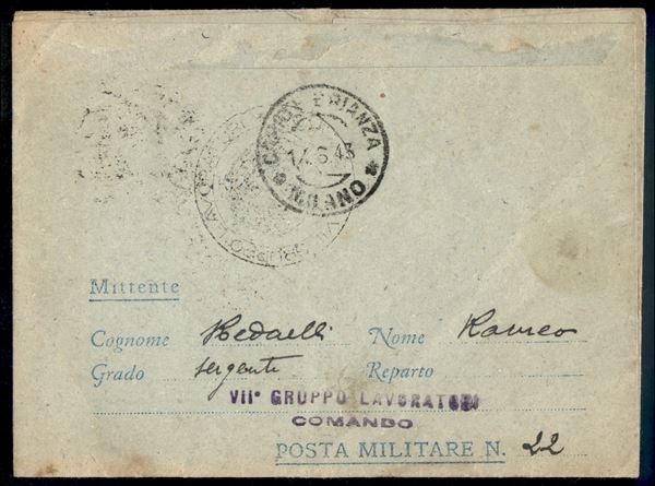 P.M. - 50 cent (7) su busta postale in franchigia dell'Ufficio Postale Militare 22 a Carate del 9 giugno 1943