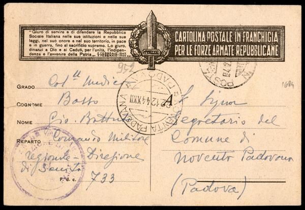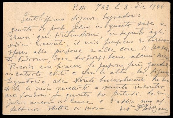 Posta da Campo N. 733 del 3.12.44 - cartolina in franchigia (19/353) per Noventa