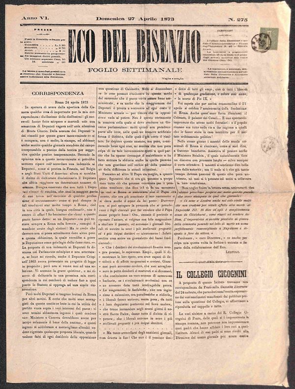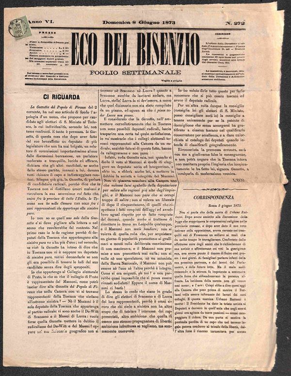 Prato (1873 - 28 aprile + 10 giugno) - Eco del Bisenzio (27 aprile + 8 giugno) - due giornali affrancati con 1 cent Torino (14)