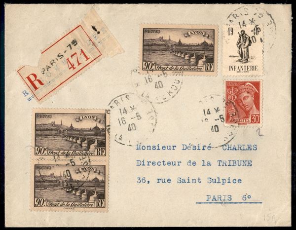 Raccomandata per cittą con affrancatura multipla (463 tre + 381) e vignetta - Parigi 16.5.40