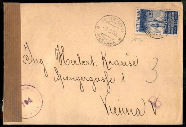Radiodiffusione 55 lire (624) isolato su lettera da Moscufo 1.8.50 per Vienna - fascetta e bollo di censura - Chiavarello