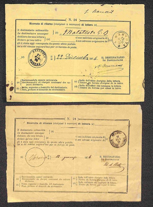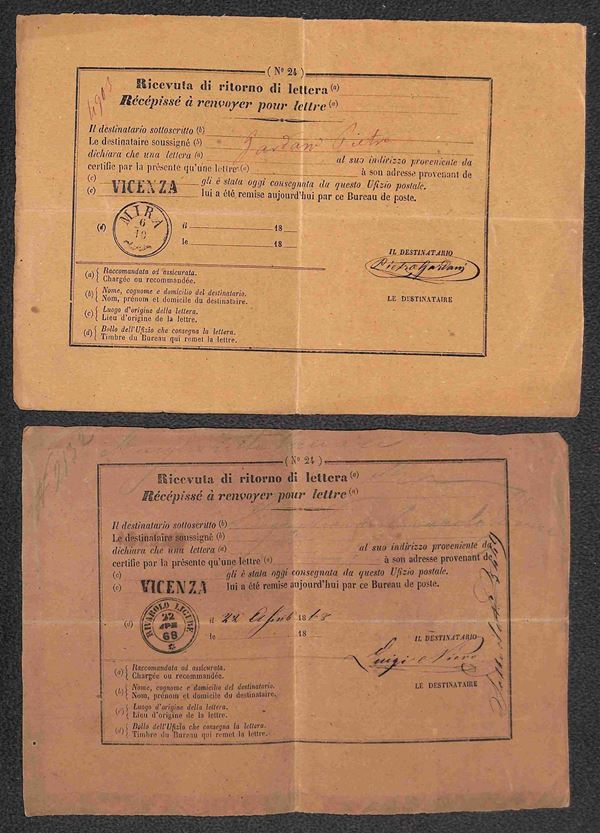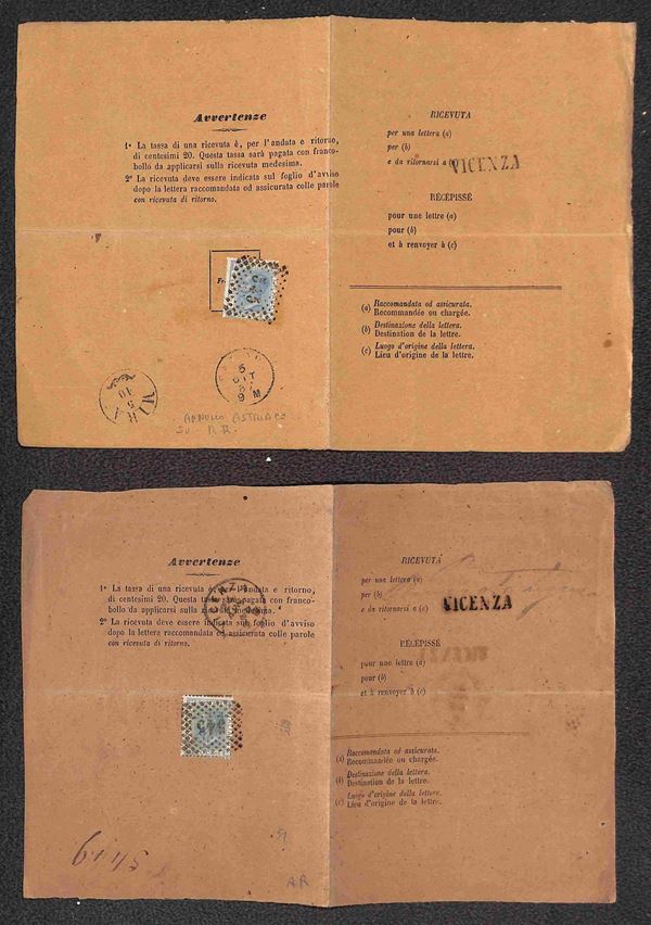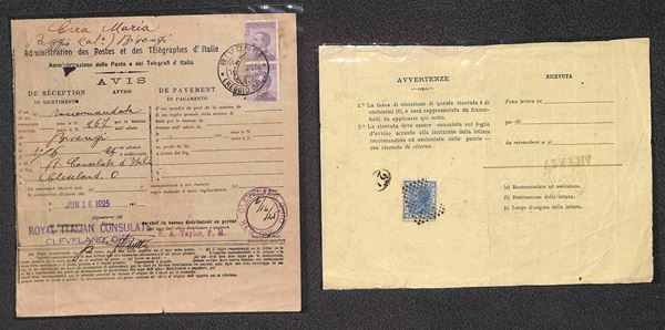REGNO - 1868/1925 - Lotto di 6 ricevute di ritorno affrancate con valori del periodo