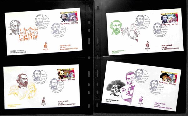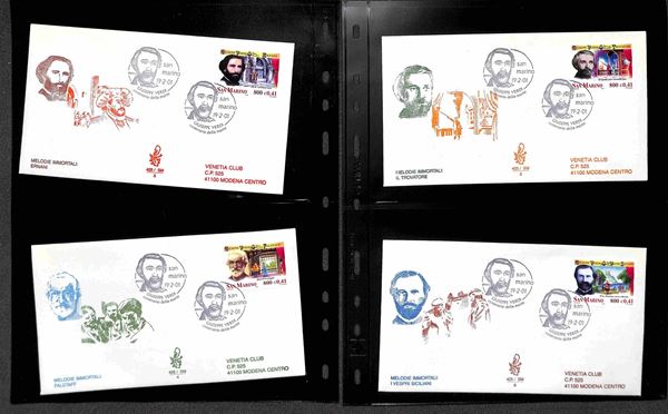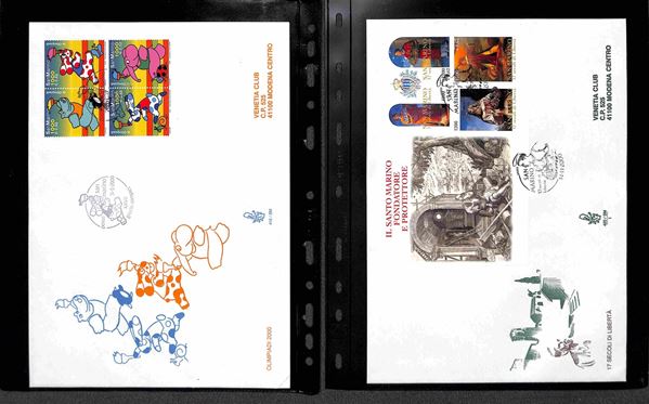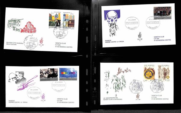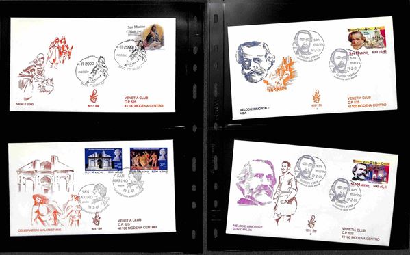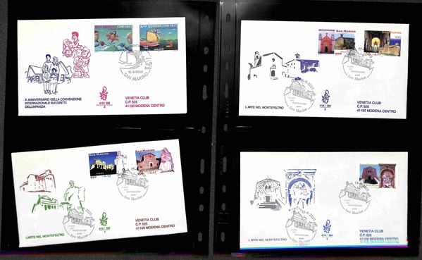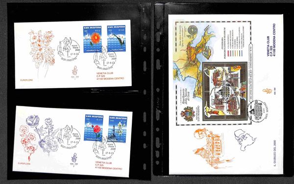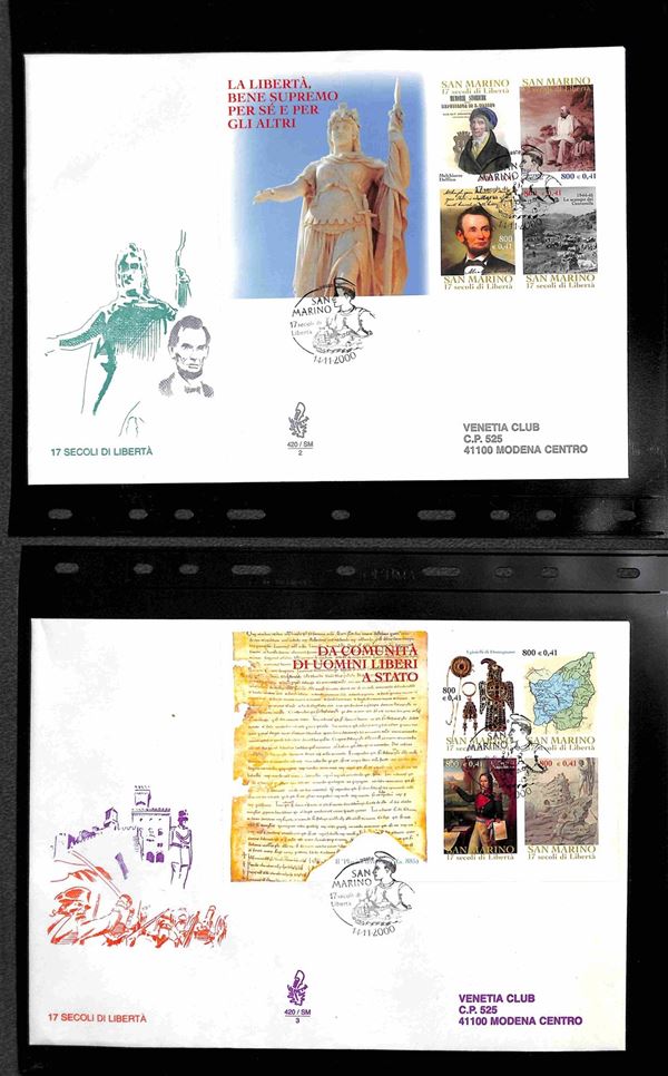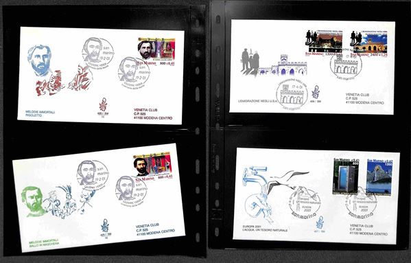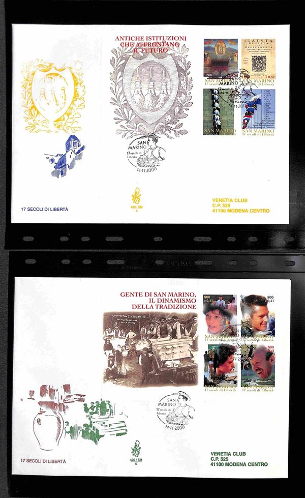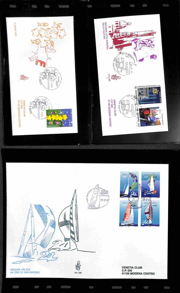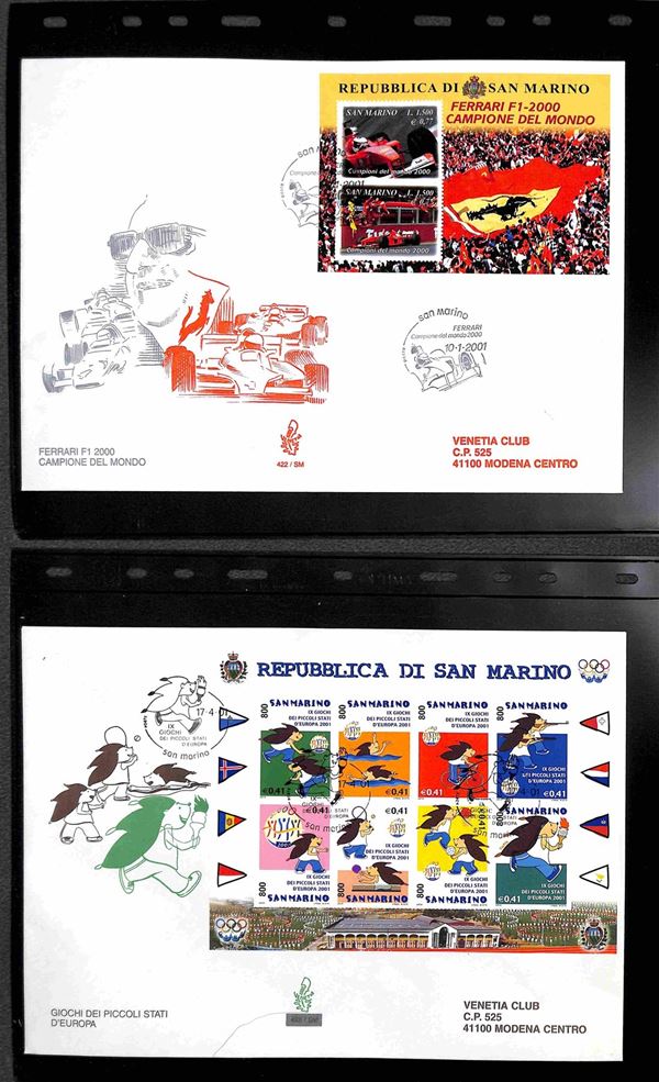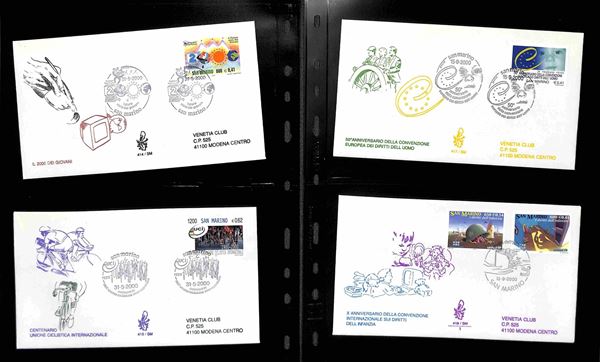 SAN MARINO - 2000 (27 aprile)/2001 (17 aprile) - FDC Venetia - le emissioni del periodo su 42 buste (compresi 8 foglietti) tutte viaggiate - montate in 14 tasche Optima