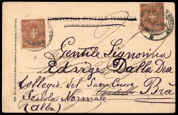 Stazione di Verdello/S.F. Meridionali/Rete Adriatica (azzurro) - cartolina per Verdello del 7 luglio 900 rispedita a Bra il 9